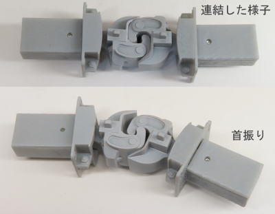 銚子電鉄デキ3用自動連結器風のナックル非可動タイプです。ナックルは動かないので、この商品同士での自動連結はできませんが、上下にスライドさせることで連結が可能です。